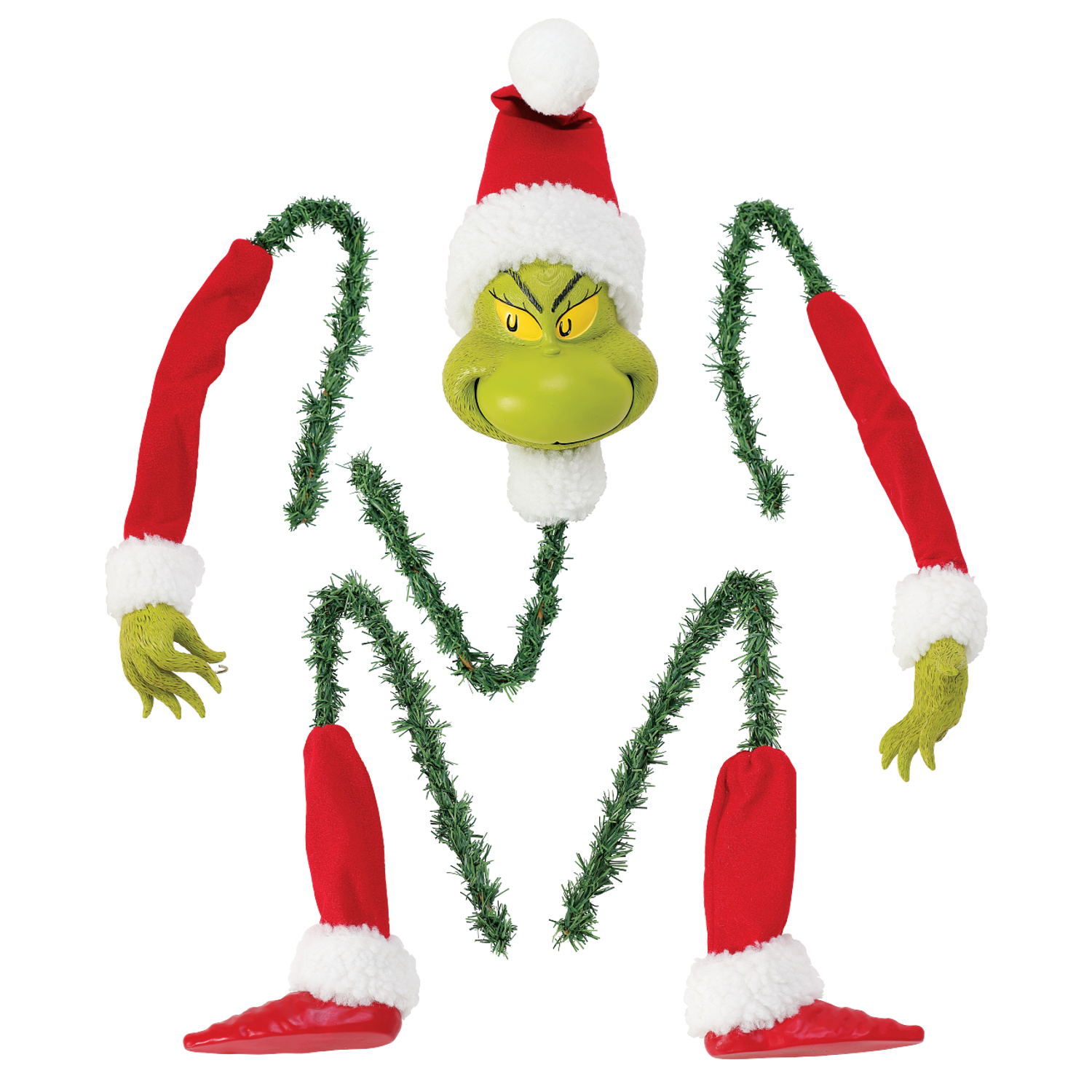 Take your favorite wreath or your Christmas tree up a notch! Add this set of arms, legs, and a Grinch face! You can easily twist and secure each piece to the branches and in his left hand there is a hook to hang your favorite ornament! Made by Department 56. Made of Metal Wire, PVC, Polyester, Clothtique. Dimensions: 8 in H x 4.5 in W x 4.5 in L. Item #: 6010192