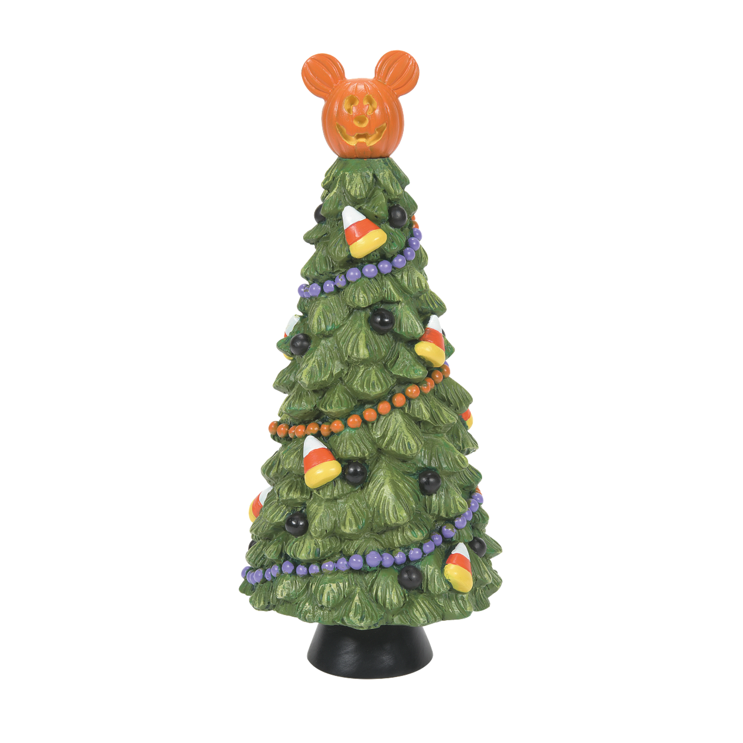 Even Halloween villages need their trees decorated! This one features colorful candy corns and black ball ornaments wrapped with purple and orange garland. The top is adorned with an orange Mickey ear pumpkin! Introduced October 2021. Made by Department 56. Made of polyresin. Dimensions: 6.625 in H x 3 in W x 3 in L. Item #: 6009782