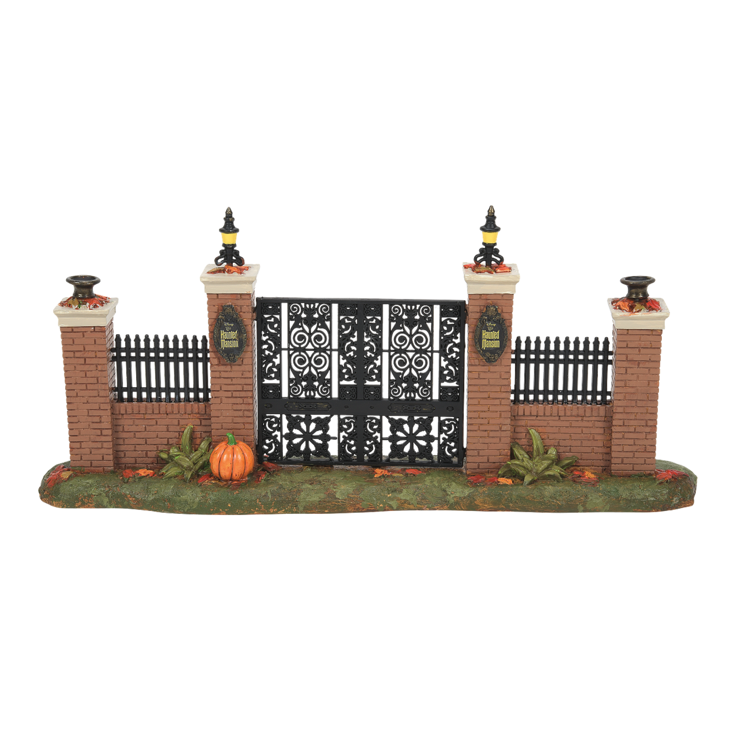 Add this gate to your Haunted Mansion village to complete your village! This fence is inspired from the Disneyland Haunted Mansion! It features brick pillars with wrought iron fencing, in the center of the brick is an ornate gate! The designs in the gate are the iconic patterns that you find inside the mansion itself! On either side of the gate is the Haunted Mansion plaque! The gate is decorated with fallen leaves, a few plants, and an orange pumpkin! Introduced January 2022. Made by Department 56. Made of resin. Dimensions: 4.75 in H x 2 in W x 10.6 in L. Item #: 6010468