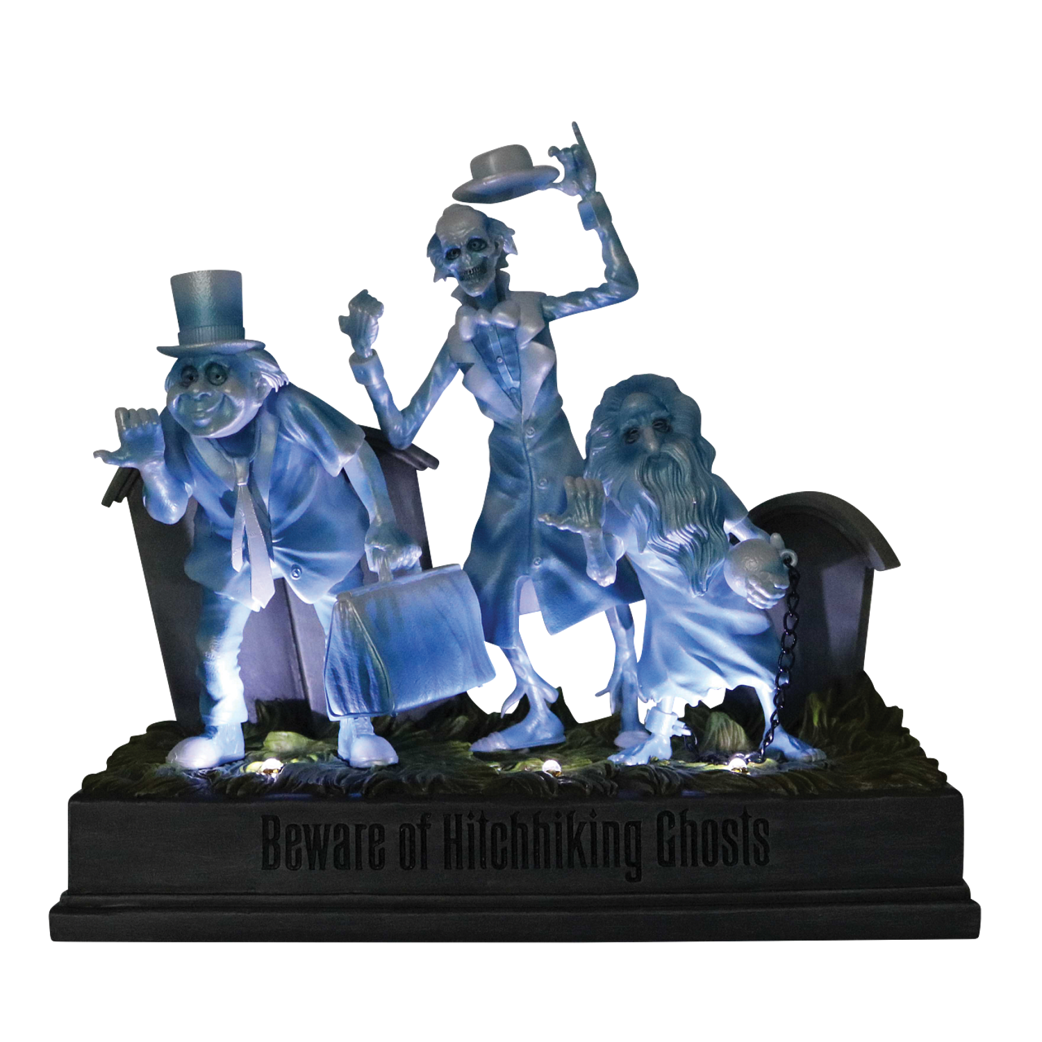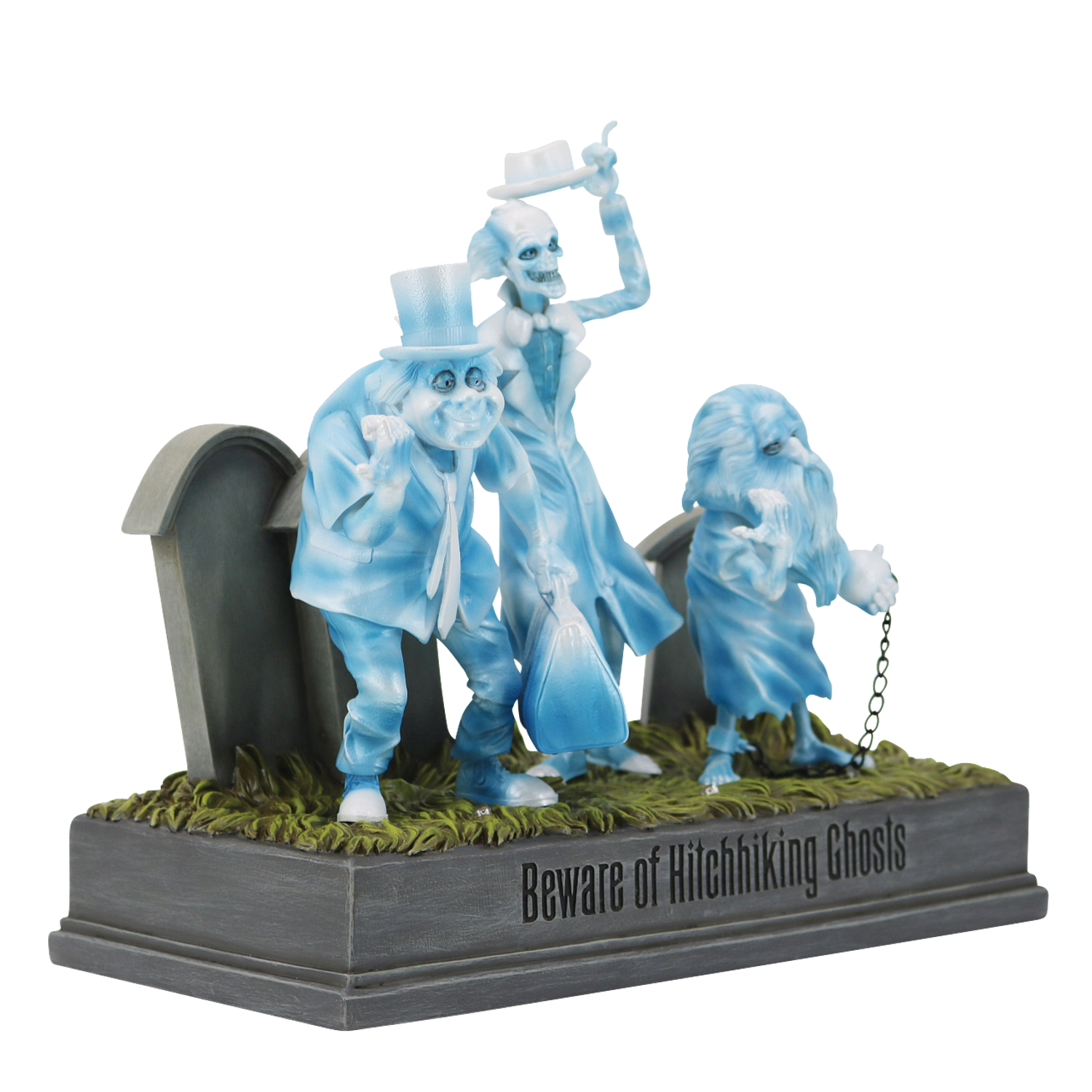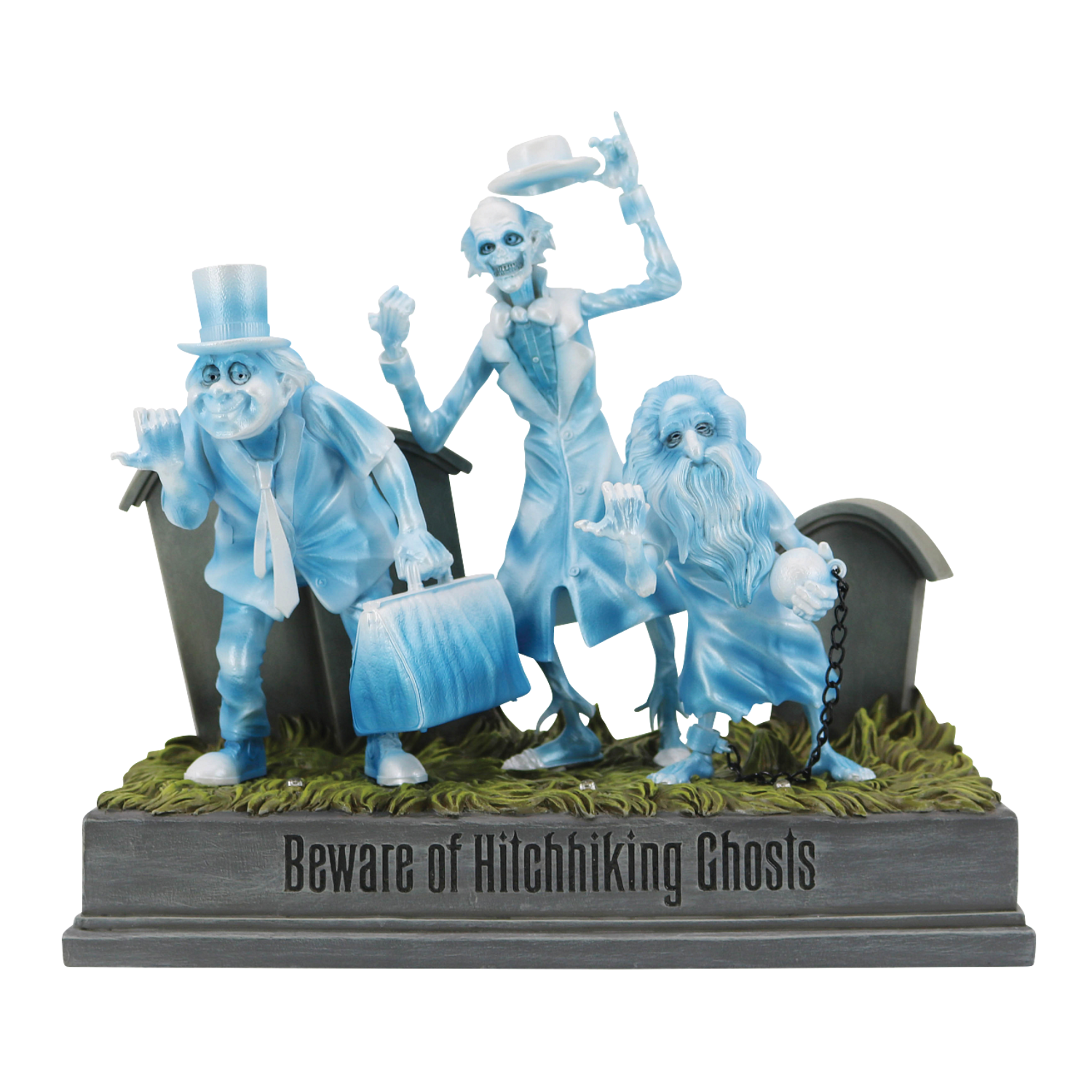 Beware of the Hitchhiking Ghosts is a well known attraction at Disney’s Haunted Mansion! This statue features Gus, Ezra, and Phineas standing in front of headstones outside of the cemetery with their thumbs out painted a bright white opalescent color with blue shadows. Perfect to add to your Haunted Mansion collection! Battery operated. Made by Department 56. Made of resin. Dimensions: 9.25 in H x 4.625 in W x 7.5 in L. Item #: 6009045