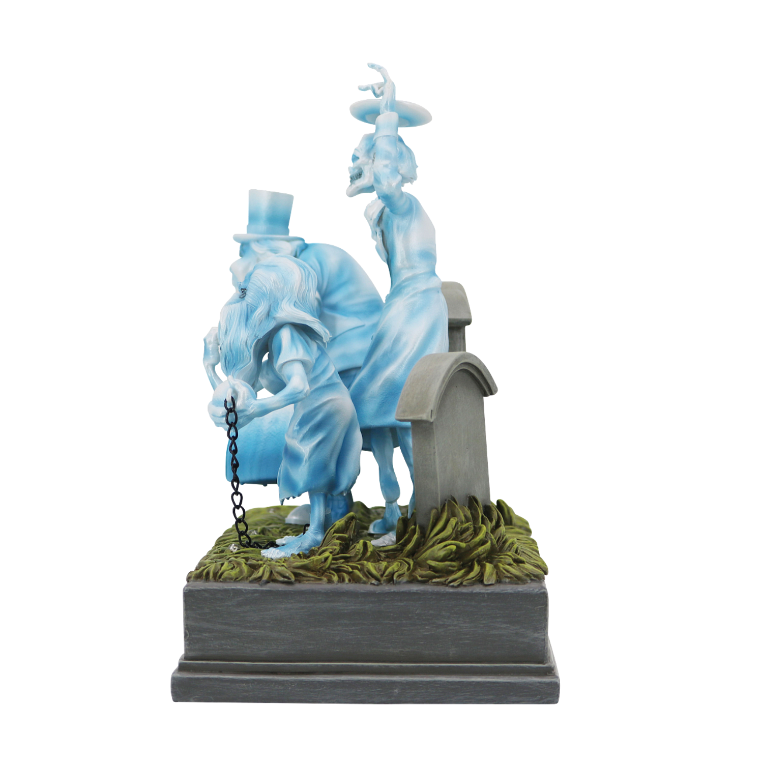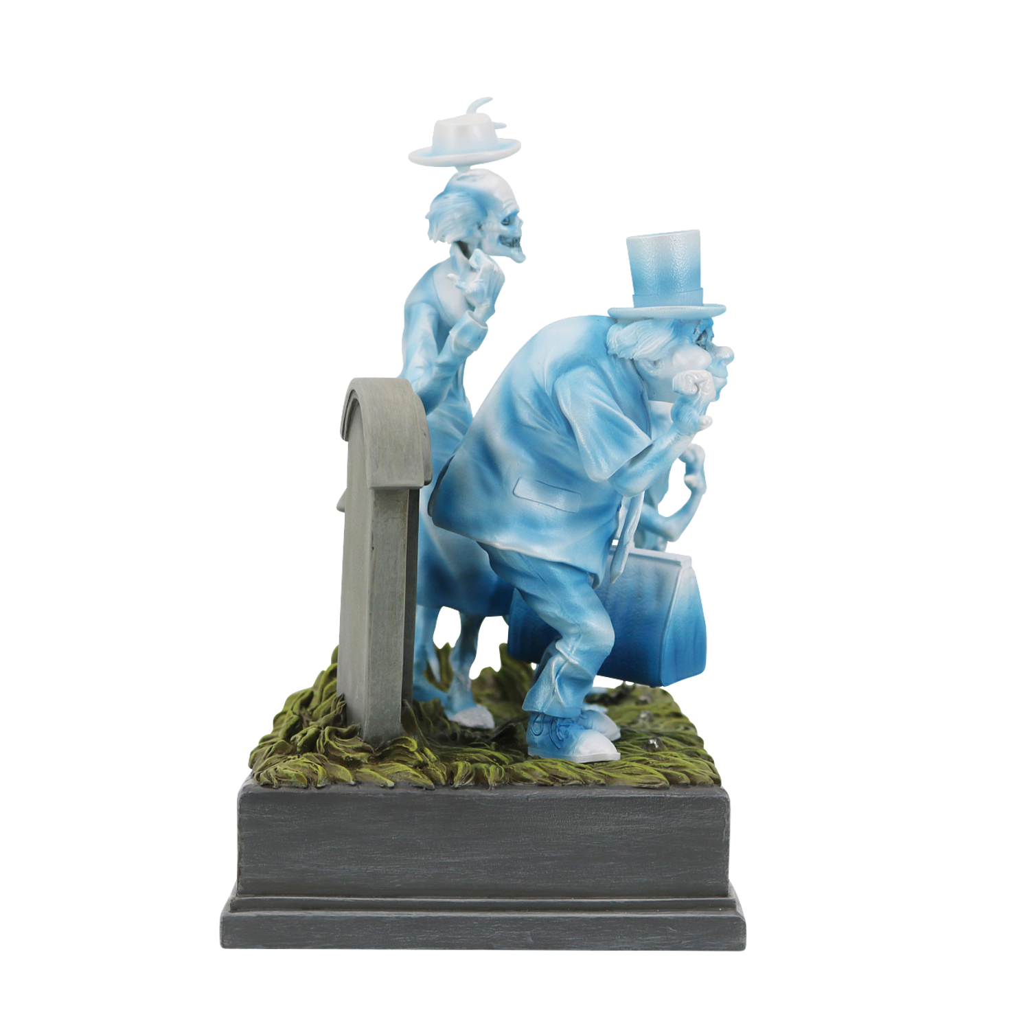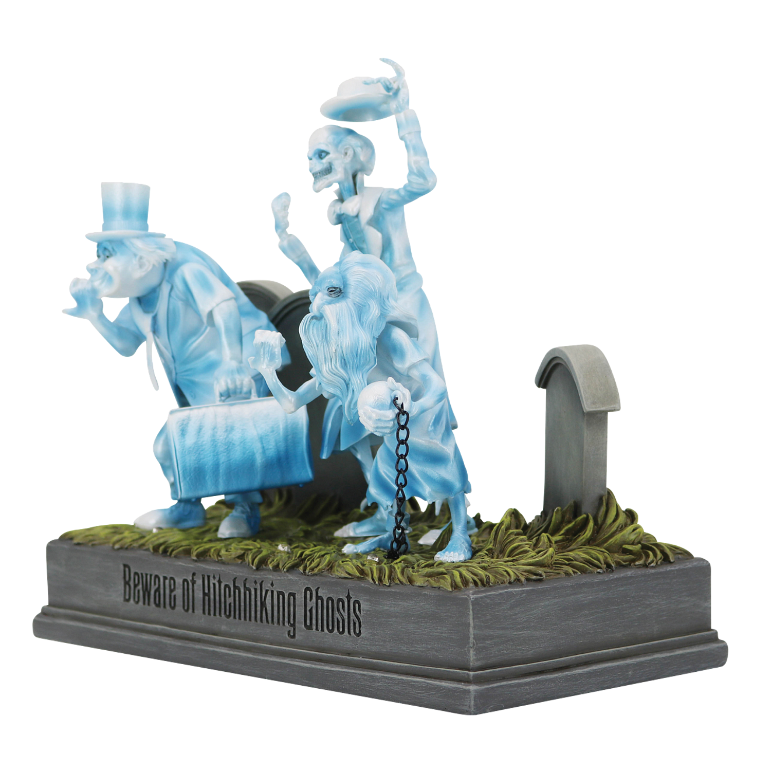 Beware of the Hitchhiking Ghosts is a well known attraction at Disney’s Haunted Mansion! This statue features Gus, Ezra, and Phineas standing in front of headstones outside of the cemetery with their thumbs out painted a bright white opalescent color with blue shadows. Perfect to add to your Haunted Mansion collection! Battery operated. Made by Department 56. Made of resin. Dimensions: 9.25 in H x 4.625 in W x 7.5 in L. Item #: 6009045