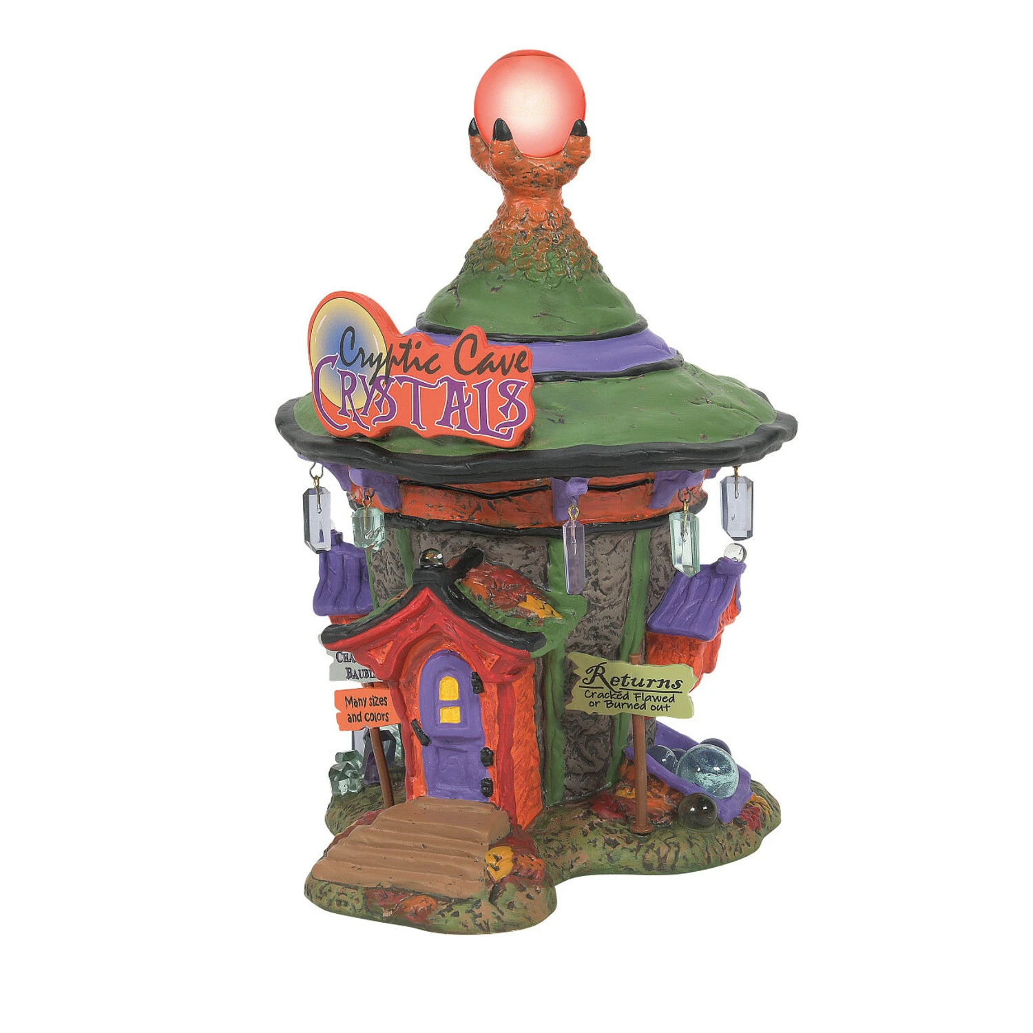 Get your magic crystals in all shapes and sizes from Cryptic Cave Crystals Shop! This unique store is a made from stone with a claw holding a crystal ball that lights up and changes colors at the top of the roof and large clear crystals dangling from the edge of the roof. On one side of the store there is a pile of old and used crystal balls and on the other side is a bundle of beautifully cut gem stones! Introduced January 2021. Made by Department 56. Made of resin. Dimensions: 7.68 in H x 5.67 in W x 4.69 in L. Item #: 6007641
