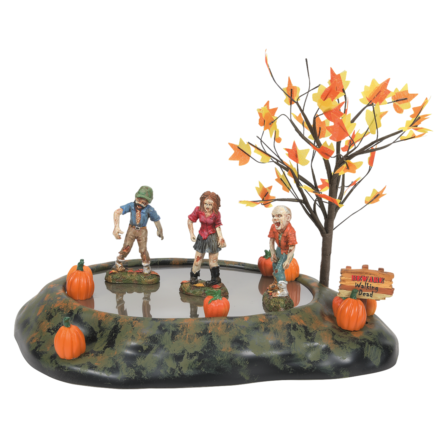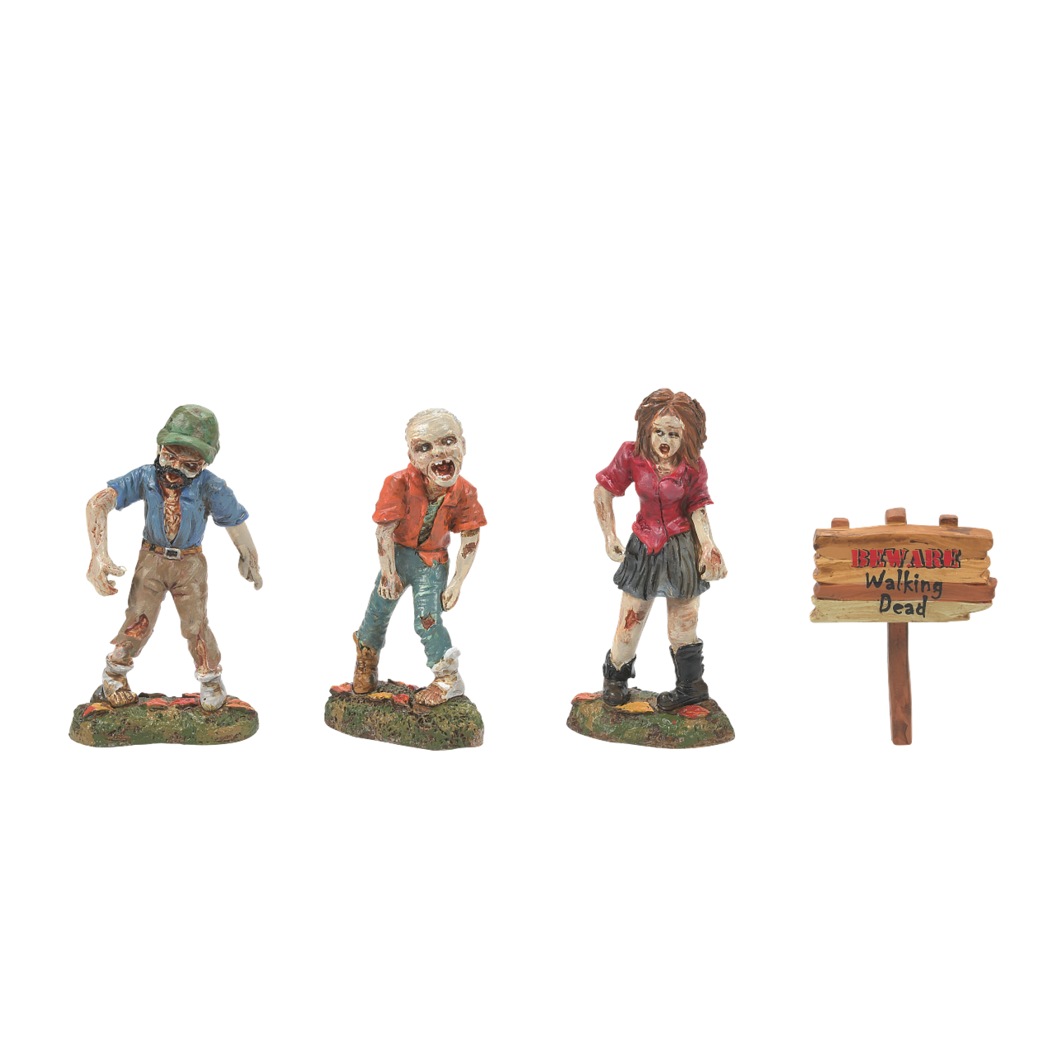 Let’s go, zombies! This animated Halloween village piece features four zombies in tattered clothes and crooked limbs with a sign that reads “Beware Walking Dead”. These figures are to be used on the Halloween base (6005554 or 6005552) Introduced October 2021. Made by Department 56. Made of polyresin and stone powder. Dimensions: 2.875 in H x 2 in W x 1.625 in L. Item #: 6009818
