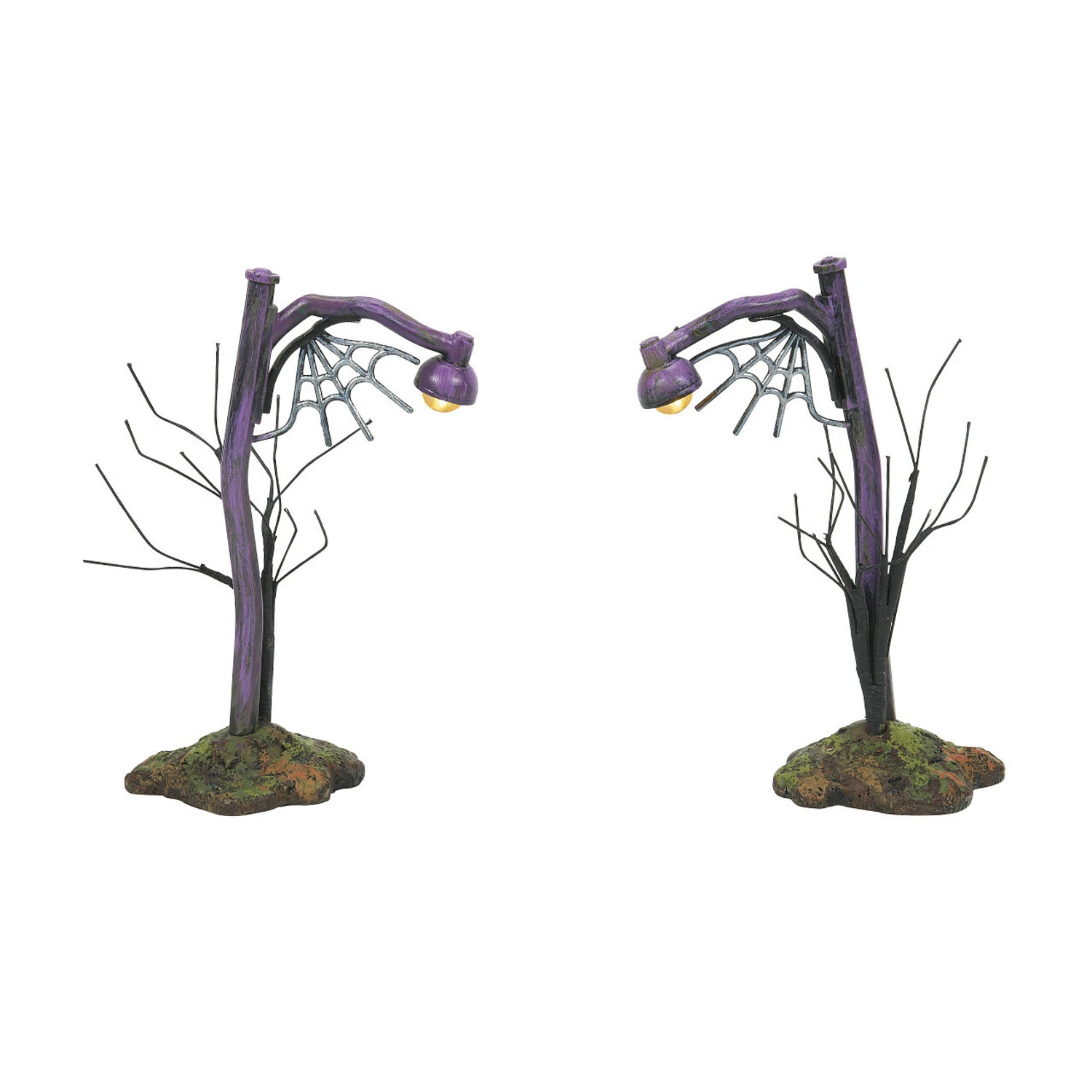 These street lights look like they’ve seen better days, but that gives them their character! Each one is a light purple color that is discolored and rusted with bends and spider webs and a wiry black tree poking up from the brown and green moss colored ground. Perfect to place along a pathway or next to your favorite Halloween house! Introduced January 2021. Battery operated, requires 2 C batteries, not included. Made by Department 56. Made of resin. Dimensions: 2 in H x 3.75 in W x 5.125 in L. Item #: 6007713