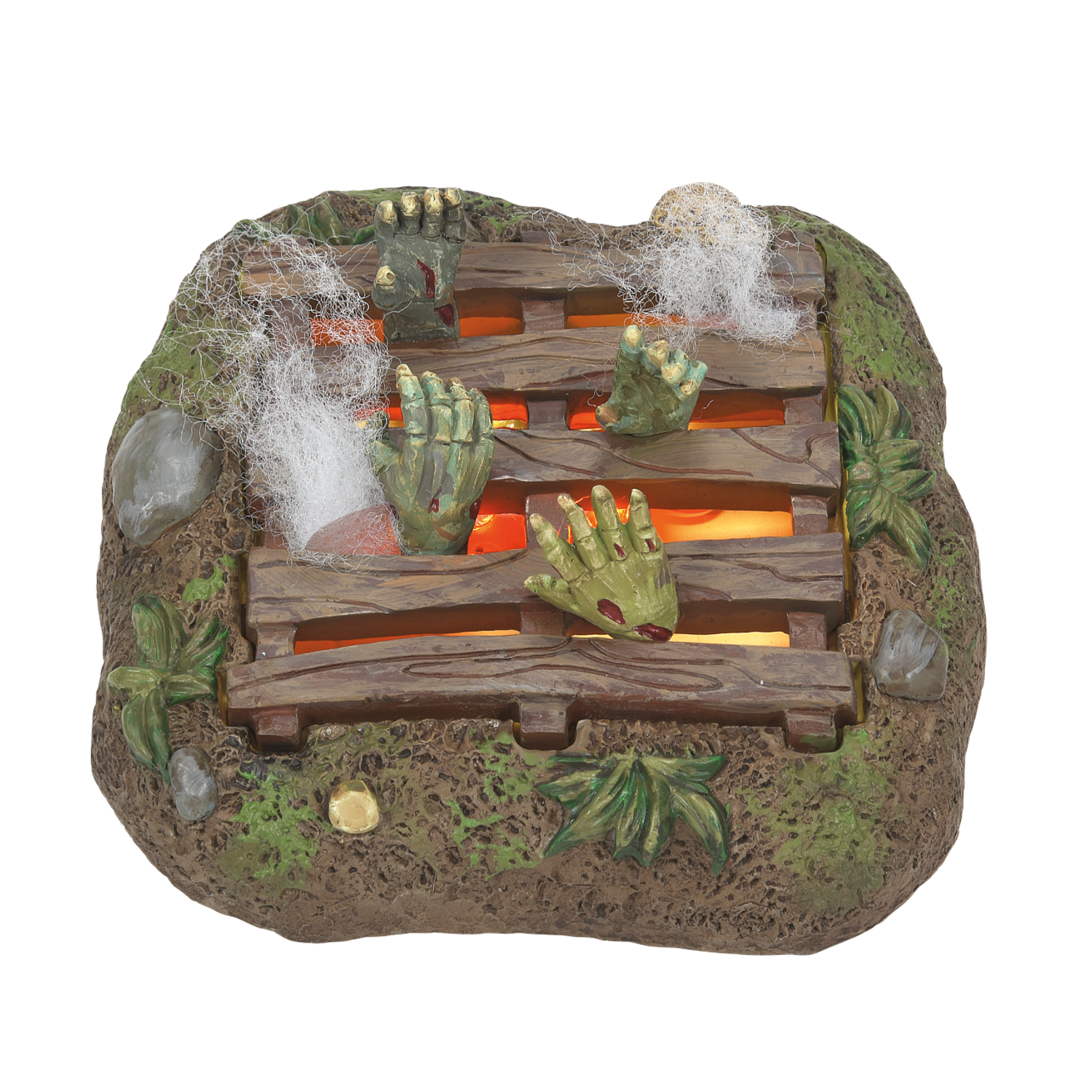 Looks like some swamp monsters are ready to come out and play for the night! This piece features a wooden grate with spooky green hands reaching out and an eerie yellowy orange light shining through! Battery operated, requires 2 C batteries- not included. Made by Department 56. Introduced Octber 2021. Made of polyresin. Dimensions: 1.625 in H x 4.25 in W x 4.25 in L. Item #: 6010457