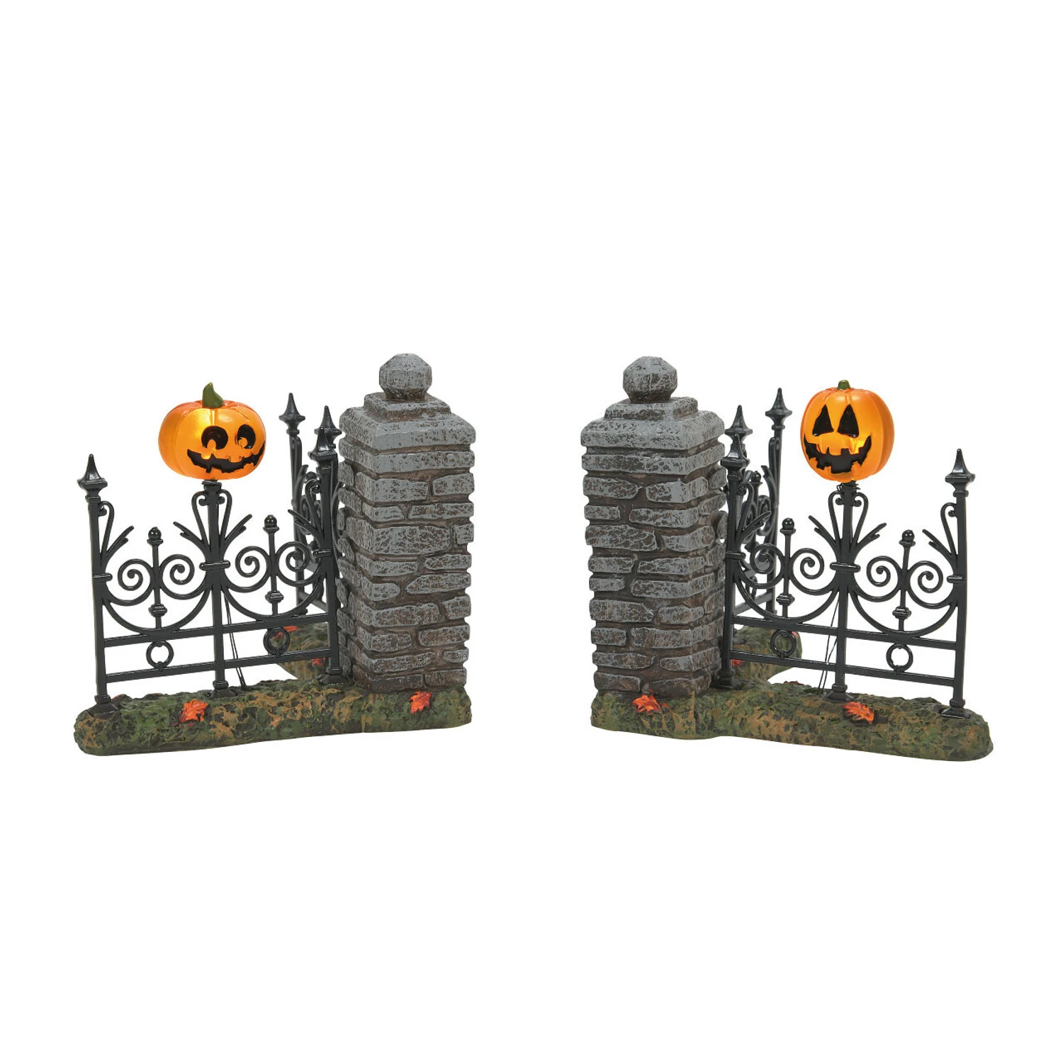 This awesome gothic fence is perfect to trim around your Halloween village! It features a stone pillar with an intricate and detailed iron fence panel attached to it. Atop the fence panel sits a light up jack-o-lantern! Introduced January 2021. Battery Operated 2-C Required, not included. Made by Department 56. Made of stone powder. Dimensions: 2.875 in H x 3.125 in W x 3.125 in L. Item #: 6007702