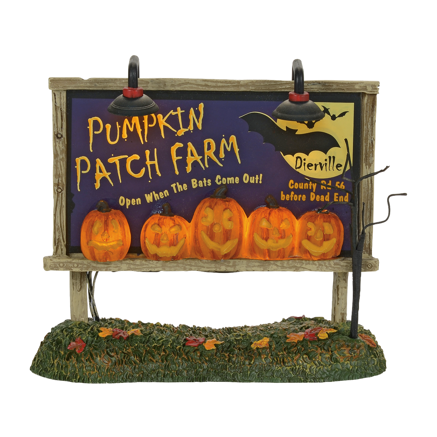 Turn down county road 56 and turn before the dead end for this spooky Pumpkin Patch! It features a rickety wooden billboard with a purple sign and yellow lettering with 5 little jack o lanterns perched at the bottom! Battery operated. Requires 2 C batteries, not included. Introduced January 2017. Made by Department 56. Made of Paper, Resin, Metal Wire, Plastic, LED. Dimensions: 4.65 in H x 2.05 in W x 5.12 in L. Item #: 4057629