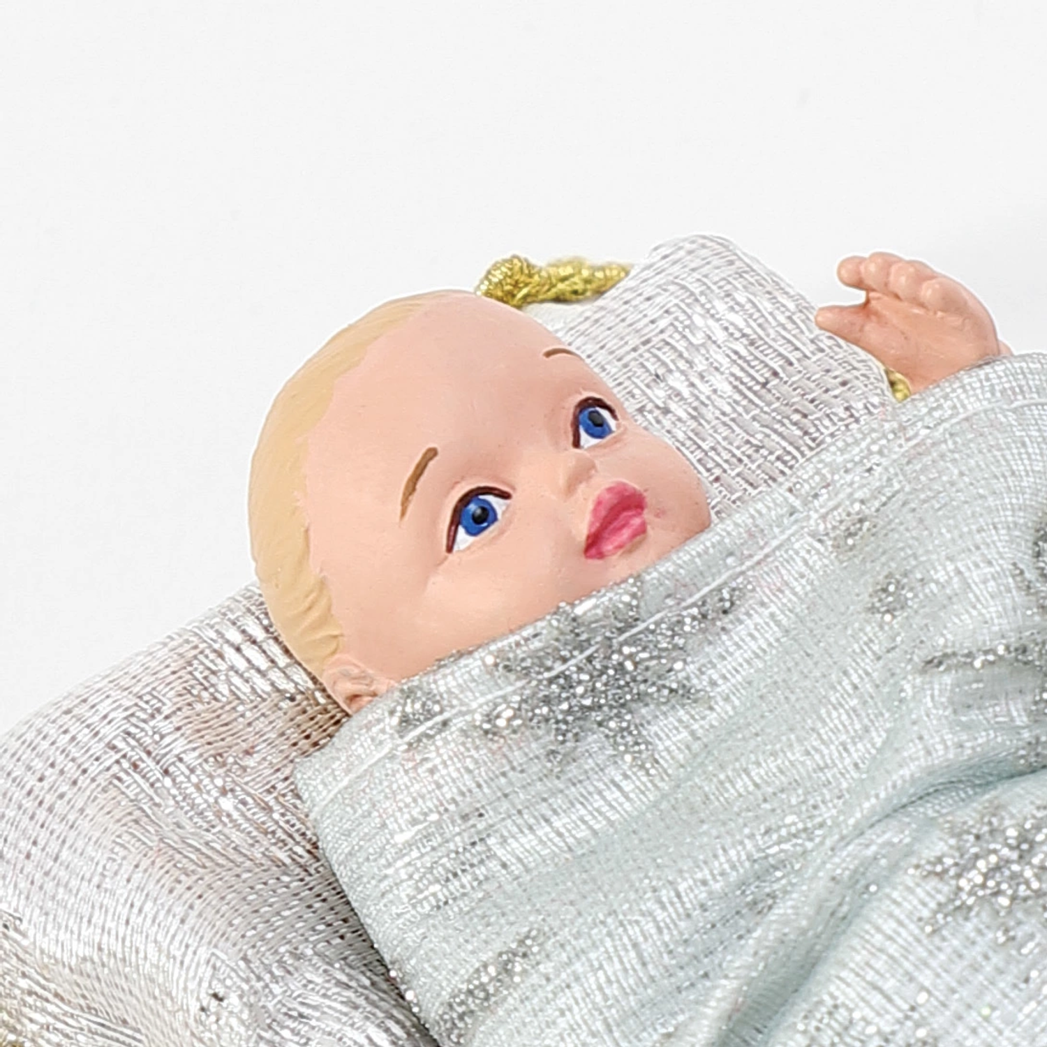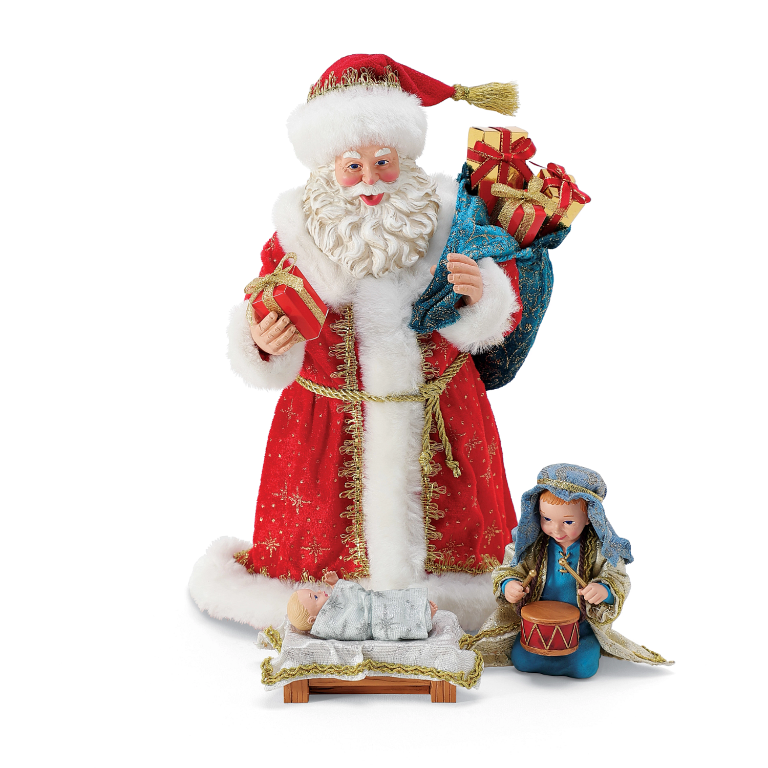 Santa has a beautiful red robe with tiny gold stars all over with a royal blue sack over his shoulder. Below him lays a baby in a manger like baby Jesus and a small child dresses as a wiseman playing a drum! Made by Department 56. Made of resin. Dimensions: 10.5 in H x 8 in W x 8 in L. Item # 6010208