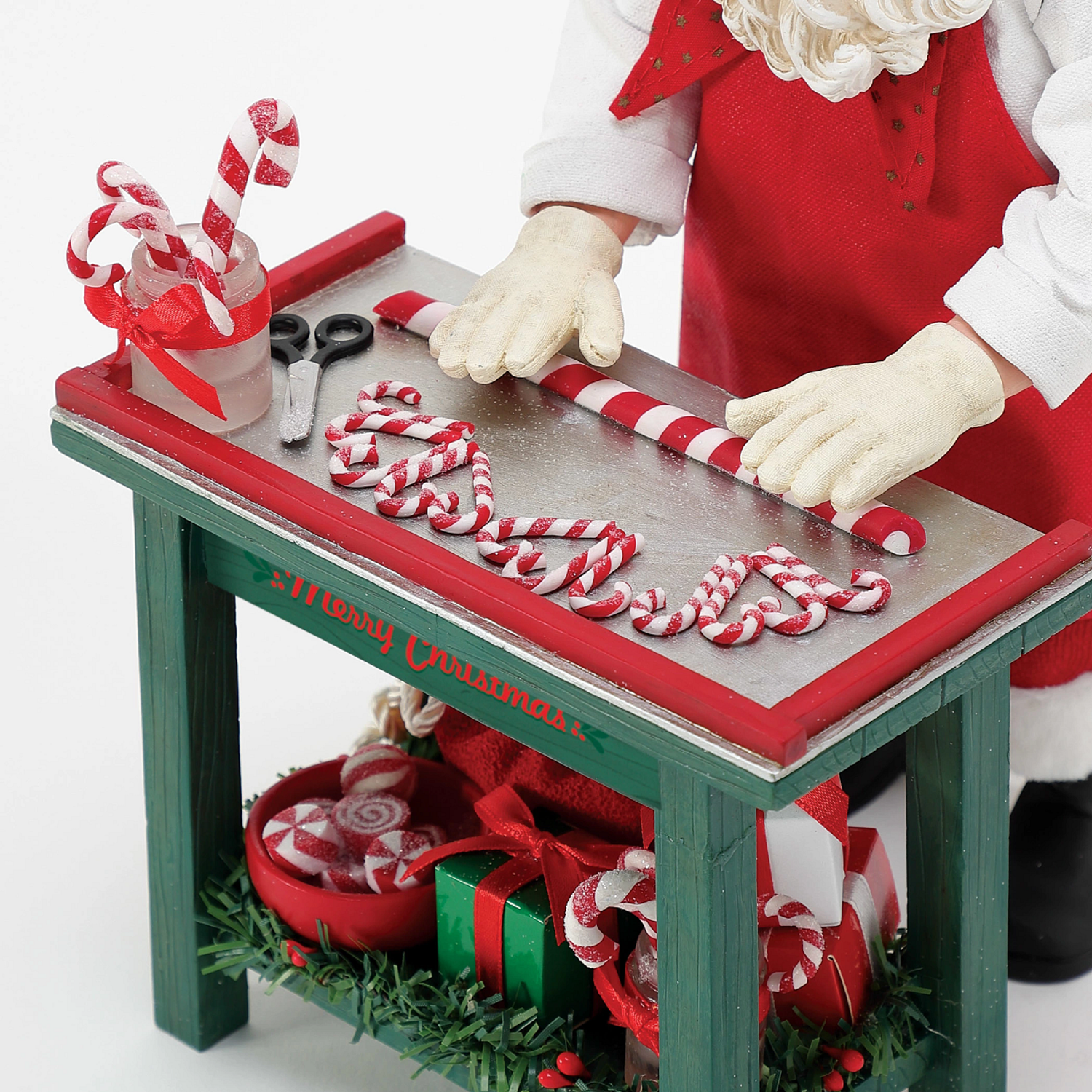 Santa takes a break toy making to make some delicious candy canes! He has on a white shirt protected by a red apron and gloves to keep his hands from getting sticky! He rolls out a red and white striped piece of candy ready to cut up and be made into minty candy canes! Made by Department 56. Made of resin. Dimensions: 10.5 in H x 7 in W x 7 in L. Item #: 6010684