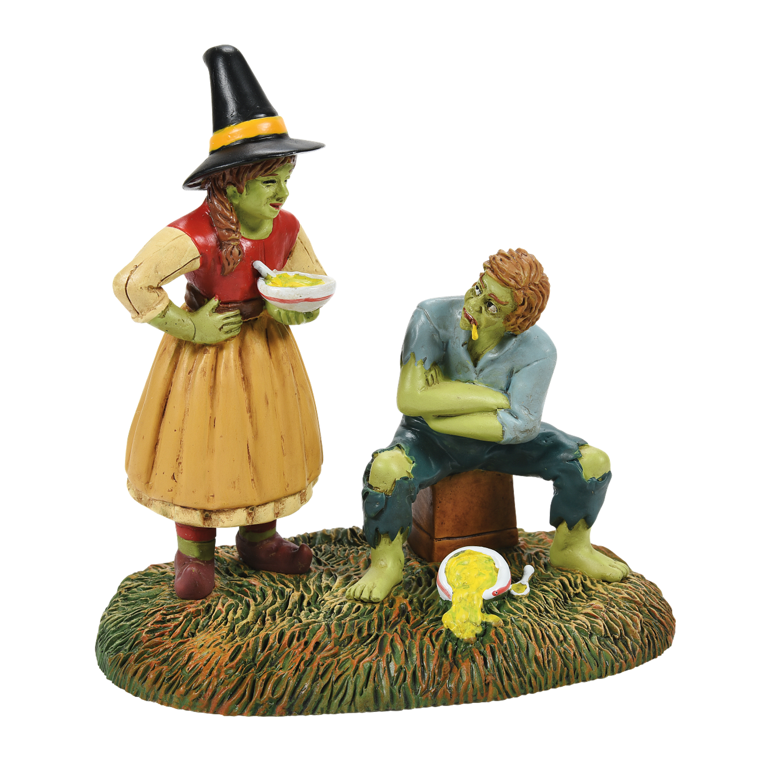Make sure you eat you Upchucks’ soup to be a big and strong ghoul! This Halloween figure needs to be added to your spooky village! It features a witch in a dress and a pointed black hat holding a piping hot bowl of soup while looking down on her zombie friend sitting on a tombstone with his arms crossed and a neon green bowl of soup spilled at his feet! It this a zombie sad about spilling his soup?….Or an unfortunate human turning zombie from eating a potion disguised as soup?! Introduced October 2021. Made by Department 56. Made of polyresin. Dimensions: 3.875 in H x 2.75 in W x 3.75 in L. Item #: 6007786