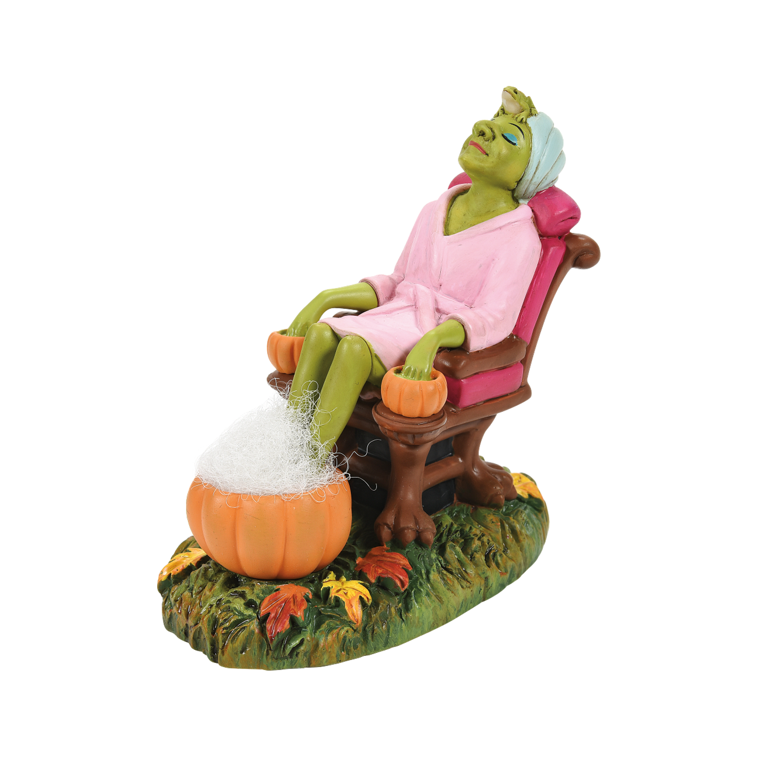 Before going out to fly around the dark Halloween night sky, make sure to stop at the spa for a sinfully good pumpkin foot bath! This figure features a bright green with relaxing in her pink robe, hair wrapped in a towel, with fingers and toes soaking! Her makeup is already done and her toad friend rests on the top of her head excited for Halloween night! Introduced October 2021. Made by Department 56. Made of polyresin. Dimensions: 3 in H x 1.875 in W x 3.375 in L. Item #: 6007782