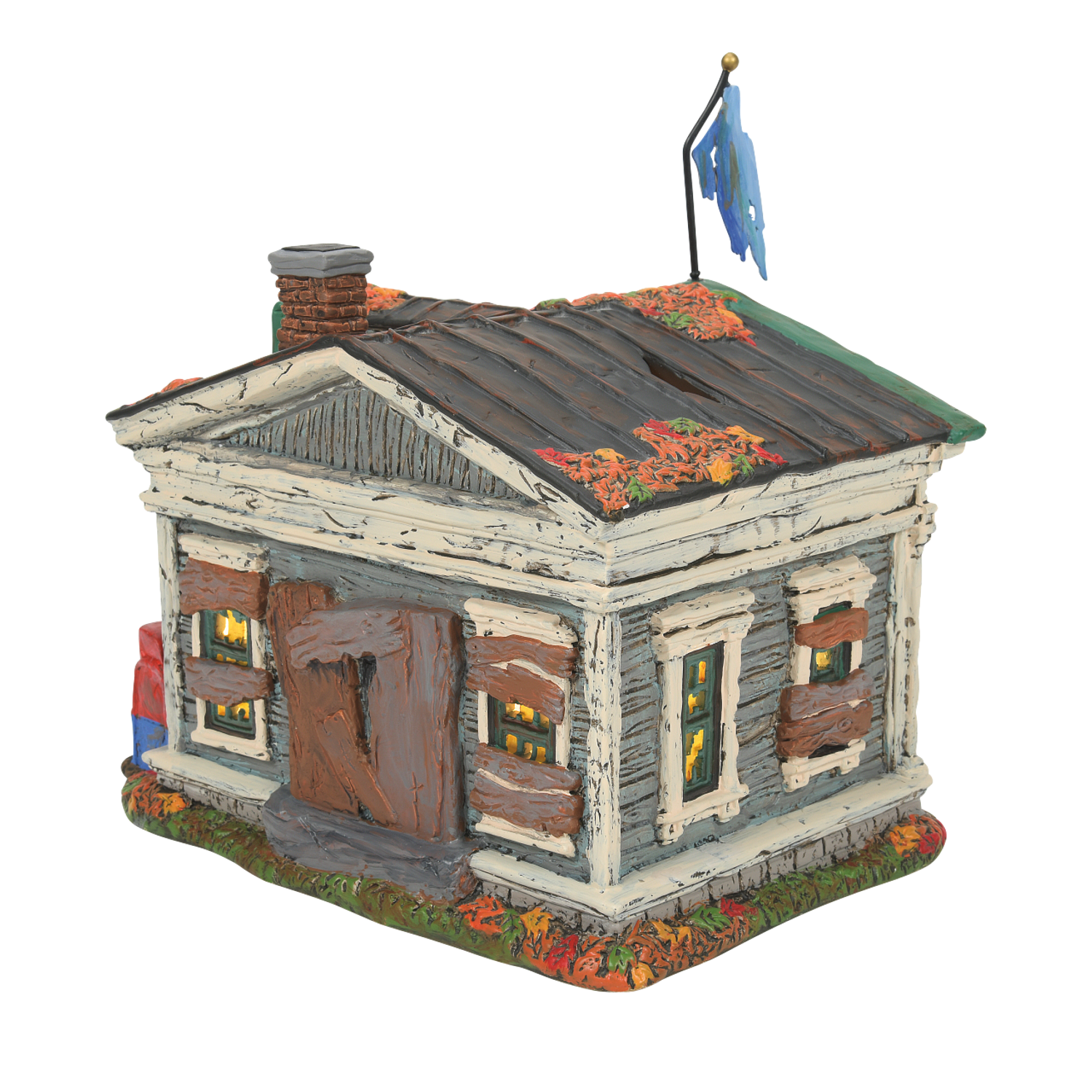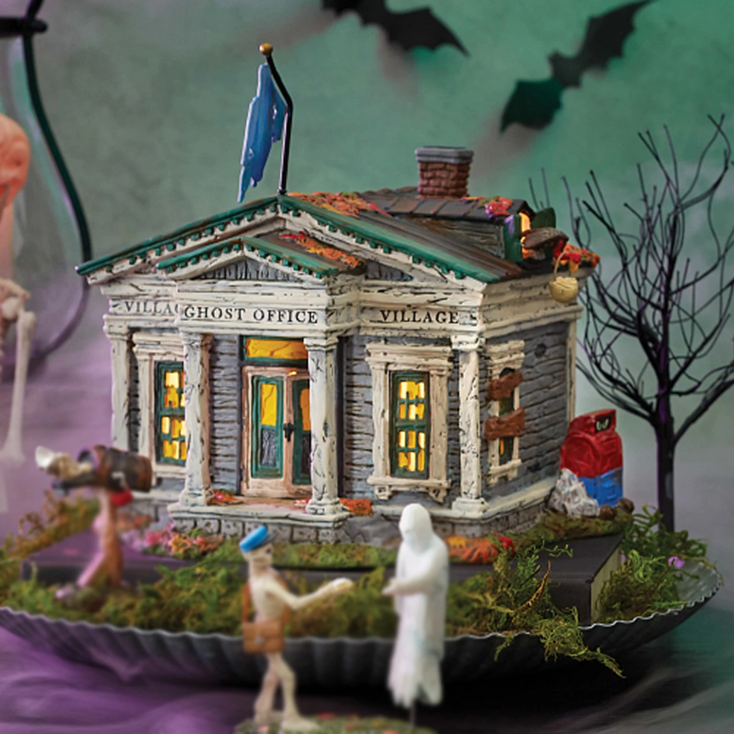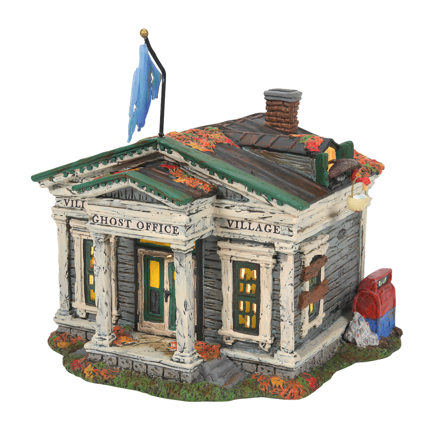 How else did you think mail got delivered and sent in Halloween town?? At the ghost office of course! This features an immaculate grey building with grey trim and windows with glass broken out. A mail drop sits on the side of the building with something lurking inside. Introduced October 2021. Made by Department 56. Made of polyresin. Dimensions: 6.77 in H x 7.4 in W x 8.54 in L. Item #: 6009777
