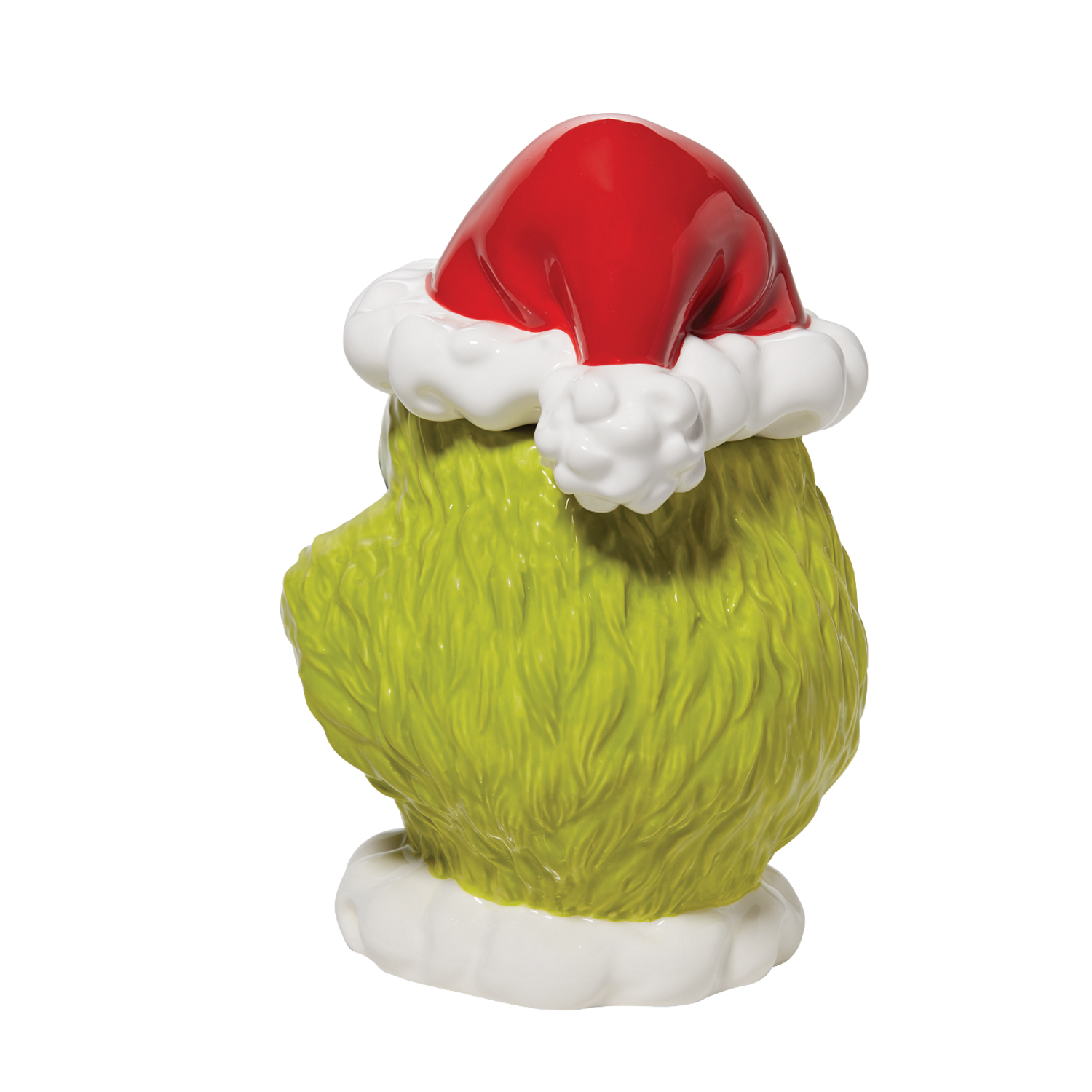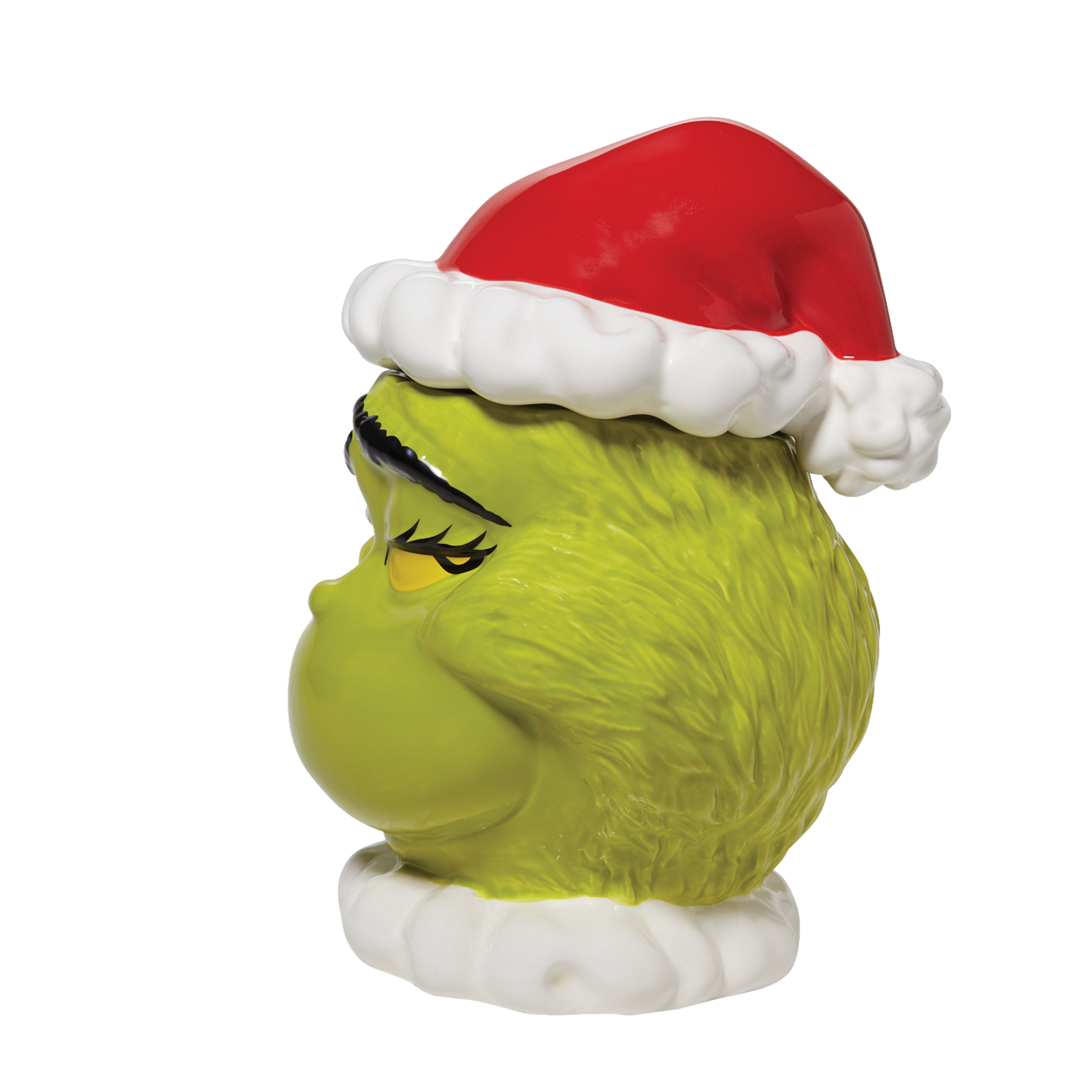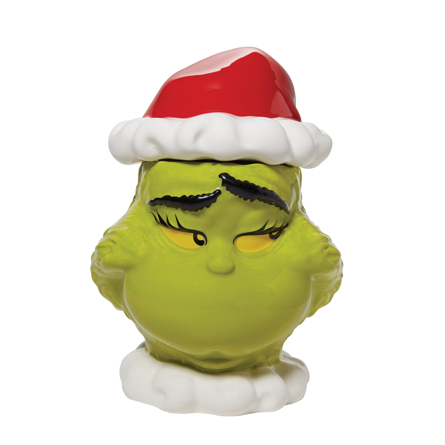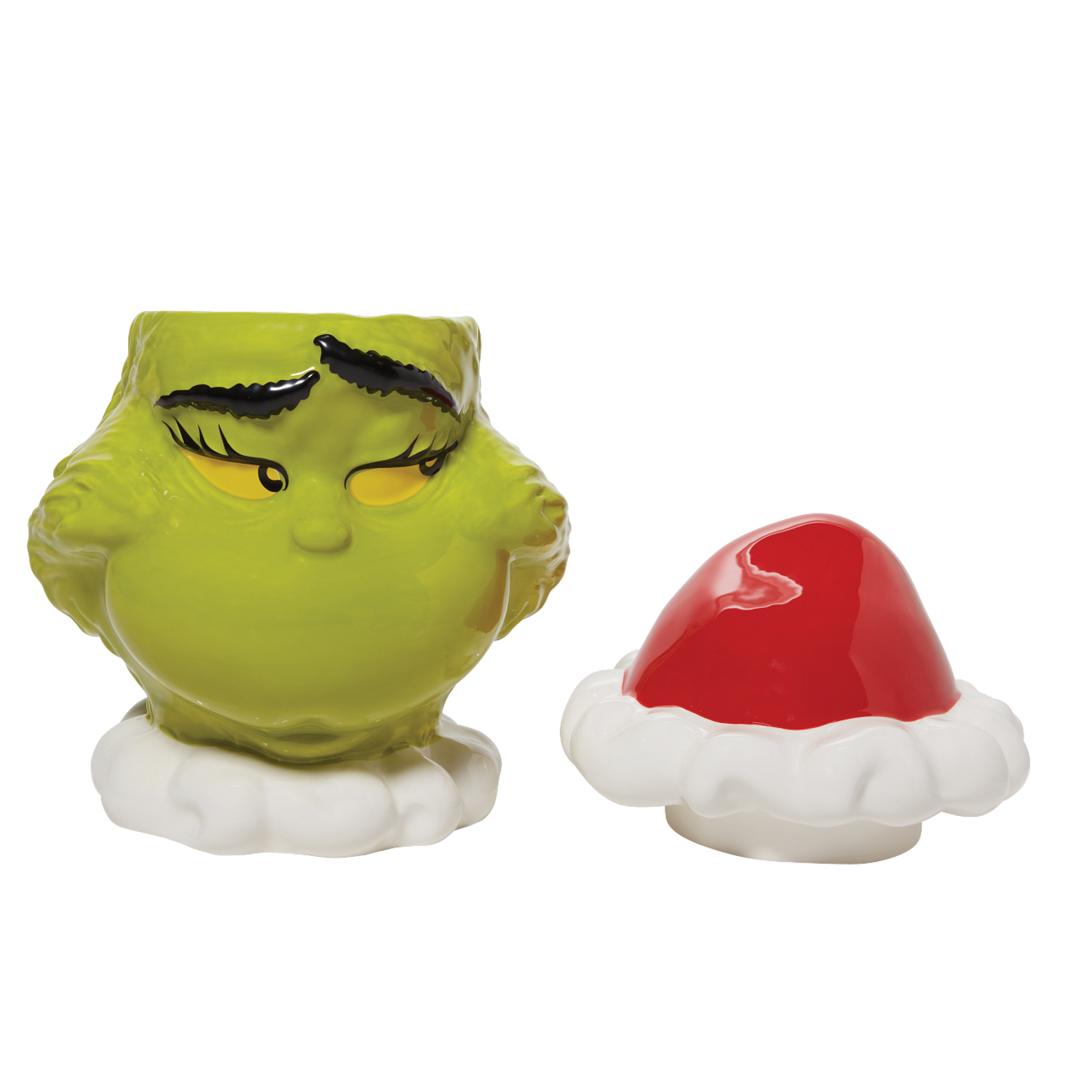 Forget Christmas, looks like the Grinch is in the cookie stealing business now! This cookie jar is the shape of the sassy green guy that we all know and love. He has one eyebrow cocked up above his yellow eyes and a red het on! Store all of your delicious cookies for the holidays this year! Made by Department 56. Made of dolomite. Dimensions: 10.24 in H x 7.48 in W x 8.66 in L. Item #: 6010964