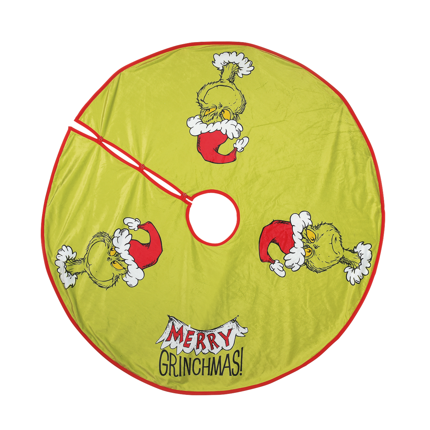 Merry Grinchmas to all, and to all a good night! If you’re a Grinch fan, then you need this who-tastic tree skirt! It features a bright green color with the Grinch smiling, sporting a mischievous face, and a frown! Made by Department 56. Made of polyester. Dimensions: 1 in H x 48 in W x 48 in L. Item #: ND6010016