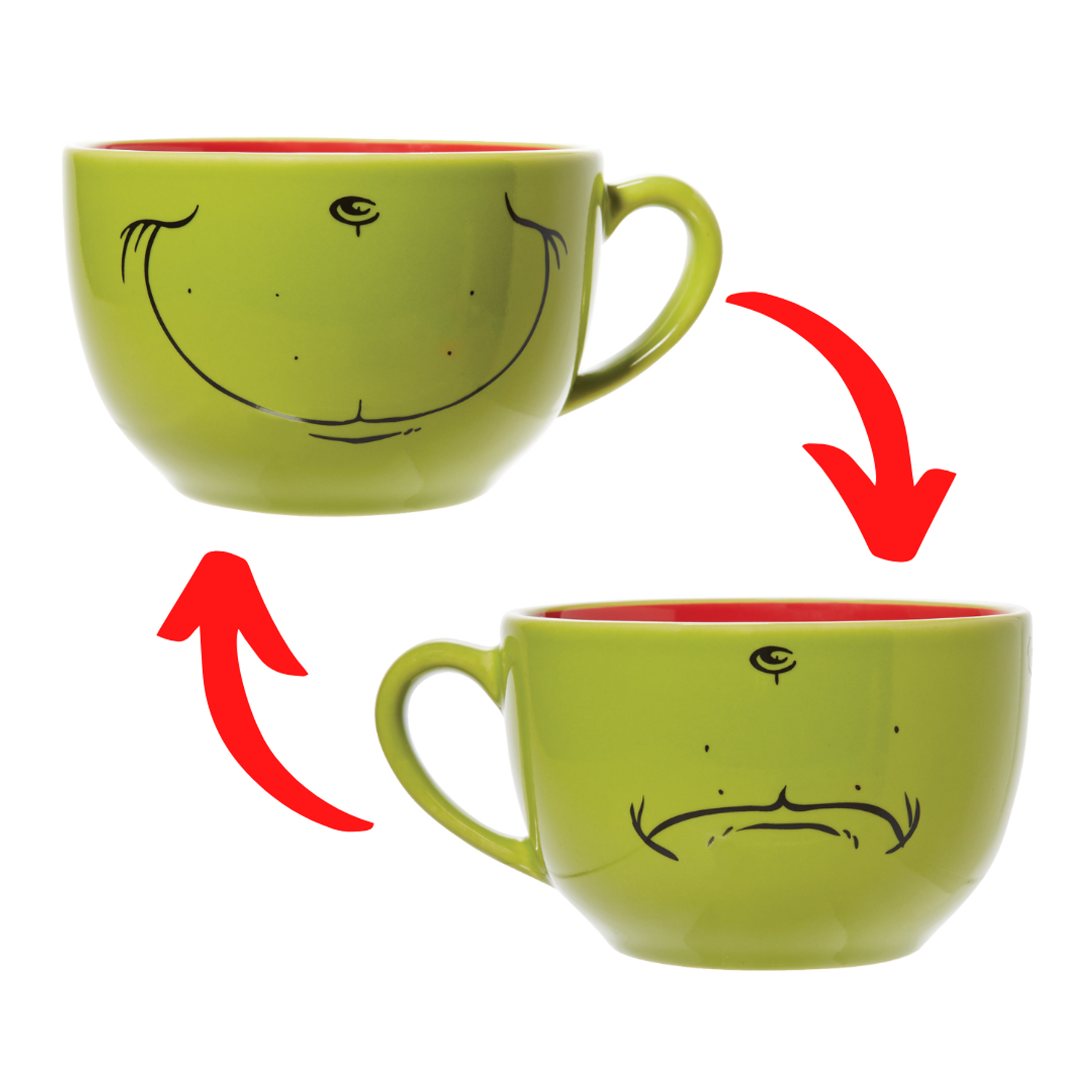 Ever wish you could silently tell people how you’re feeling?? This mug has got you covered! It features a bright green color with a red inside. On each side on the mug is a famous Grinch face! Have the smile side showing when you’re feeling Who-tastic, and the disgruntled frown side when you’re feeling like the Grinch pre-heart growing in size. Made by Department 56. Made of stoneware. Dishwasher safe, Microwave safe. Dimensions: 2.76 in H x 4.65 in W x 5.9 in L. Item #: 6010966