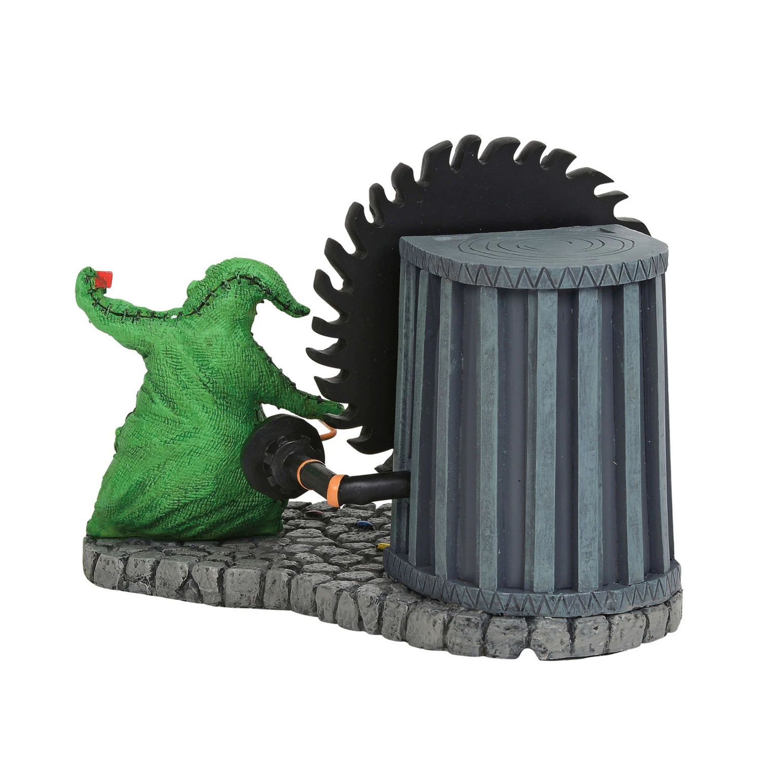 This is the iconic scene in The Nightmare Before Christmas after Lock, Shock, and Barrel kidnap Sandy Claws and deliver him to the evil gamblin’ Oogie Boogie! It features a skeleton strapped to the spinning wheel and the Boogie Man with his hand on the lever and dice in the other hand! This piece lights up and the wheel actually turns! Made by Department 56. Introduced April 2019. Electric, adapter included. Made of stone powder. Dimensions: 4.33 in H x 3.74 in W x 6.7 in L. Item #: 6004819